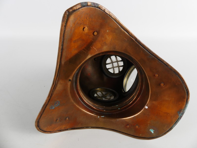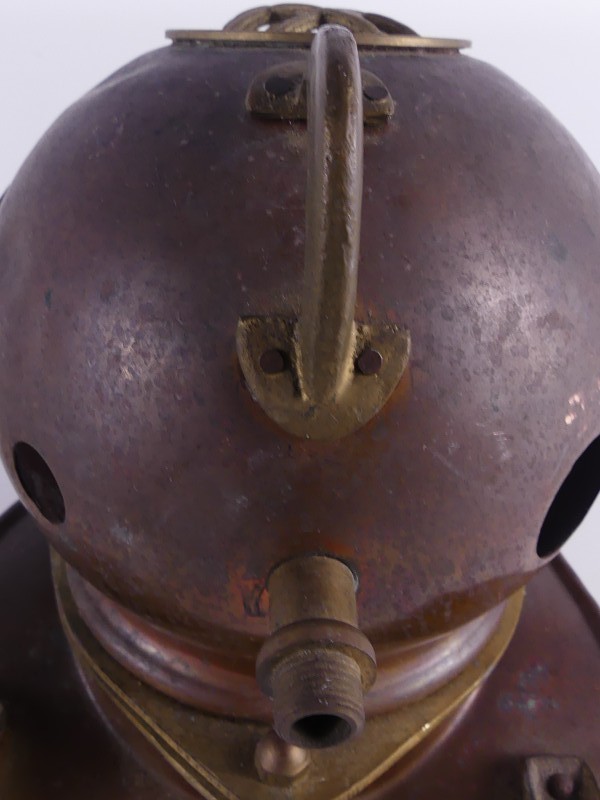 Het is een mooi, gedetailleerd miniatuur van een historische koperen en messing duikhelm, perfect voor liefhebbers van maritieme decoratie.