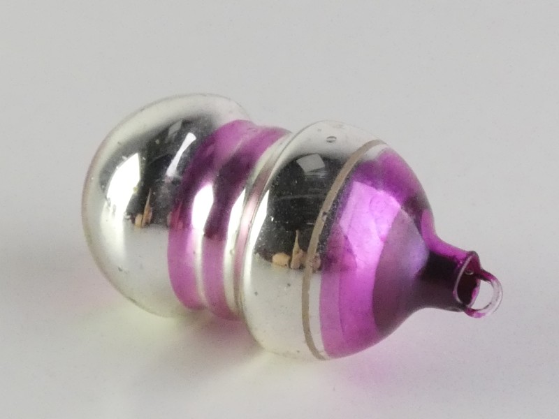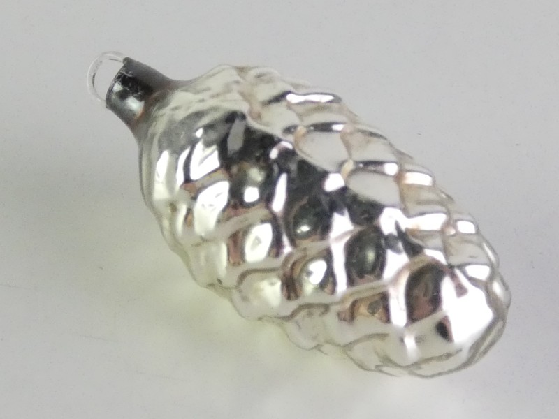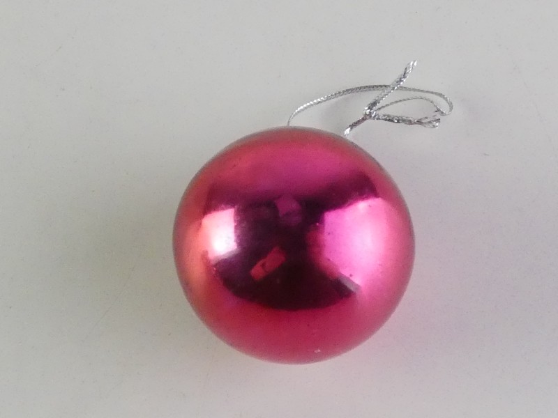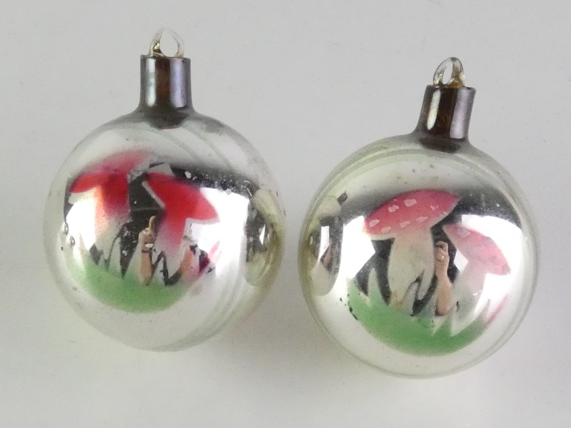 Lot van 7 oude AJEKO-kersballen: namelijk ( 1 kleurloze glazen dennenappel, 6,5 cm, 1 gebogen roze en witte bal, 8 cm, 2 ballen met afbeeldingen van vliegenzwammen, diameter 6 cm, 2 kleine ballen met blauwe en roze strepen patroon, 4,5 cm, 1 rose bal, 4,5 cm.