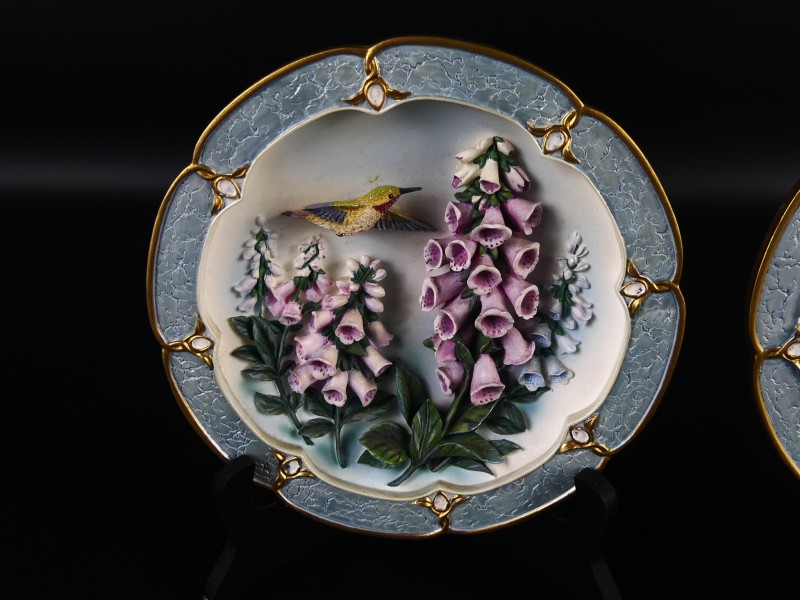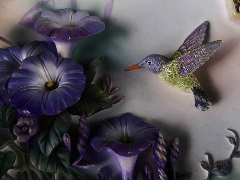 Elk bord toont een bloemcompositie met een kolibrie in reliëfdecor en is afgewerkt met goudaccenten. Gelimiteerde oplage, genummerd en voorzien van ophanghaakjes. Romantisch en verfijnd wanddecor.