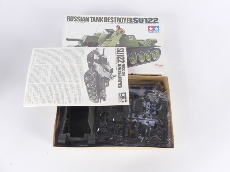 Vier bouwdozen van Tamiya in schaal 1/35, allemaal militaire voertuigen. Inhoud lijkt compleet en grotendeels OVP. Dozen kunnen lichte schade vertonen.
