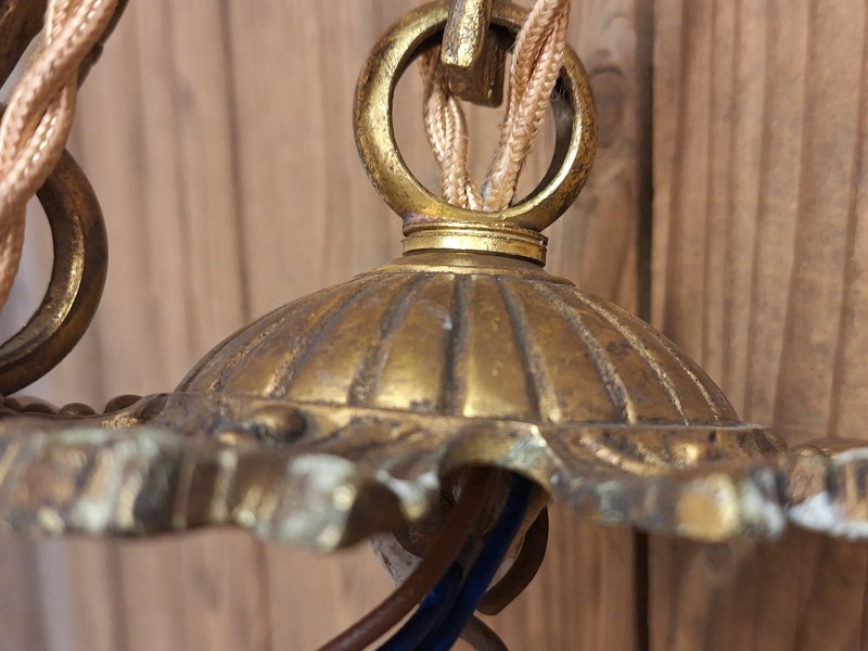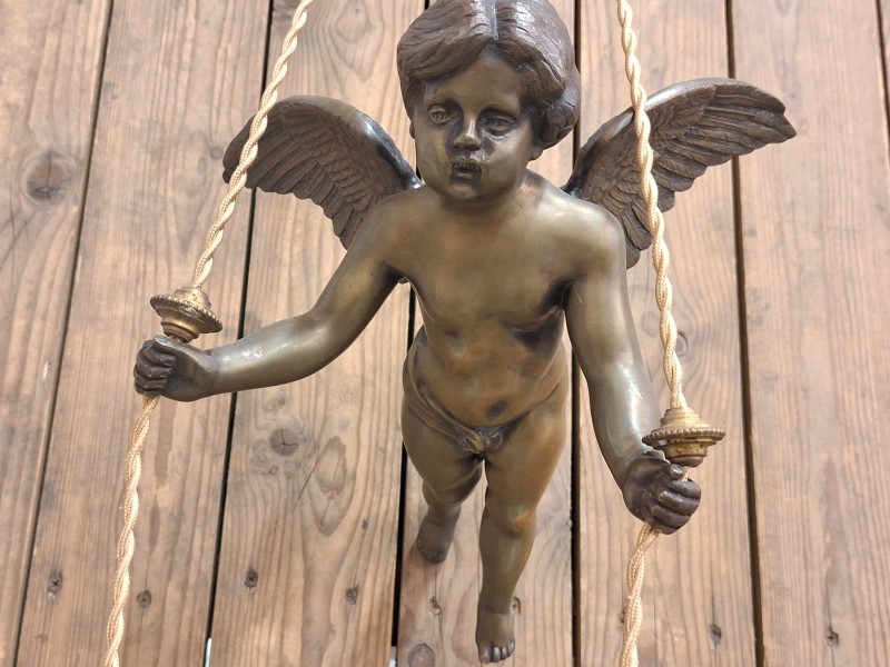 Het centrale kenmerk is het gedetailleerde beeldje van een zwevende engel die de touwen vasthoudt. De kapjes hebben een roze patina en zijn van matglas.Er zijn wat stukjes af van de kapjes