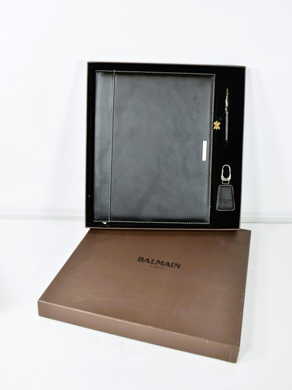 Luxe schrijfmappenset van het Franse modehuis Balmain Paris. De set bestaat uit een schrijfmappenhouder, een metalen balpen en een sleutelhanger met Balmain-stempel. De map is gemaakt van kunstleer in zwart met witte stiksels, voorzien van het Balmain-logo. Binnenin zitten een schrijfblok, een vak voor documenten en ruimte voor visitekaartjes. De balpen heeft een chroomkleurige afwerking en een stijlvol ontwerp. De set zit in de originele Balmain-doos en is ontworpen voor zakelijk gebruik of als stijlvol relatiegeschenk.