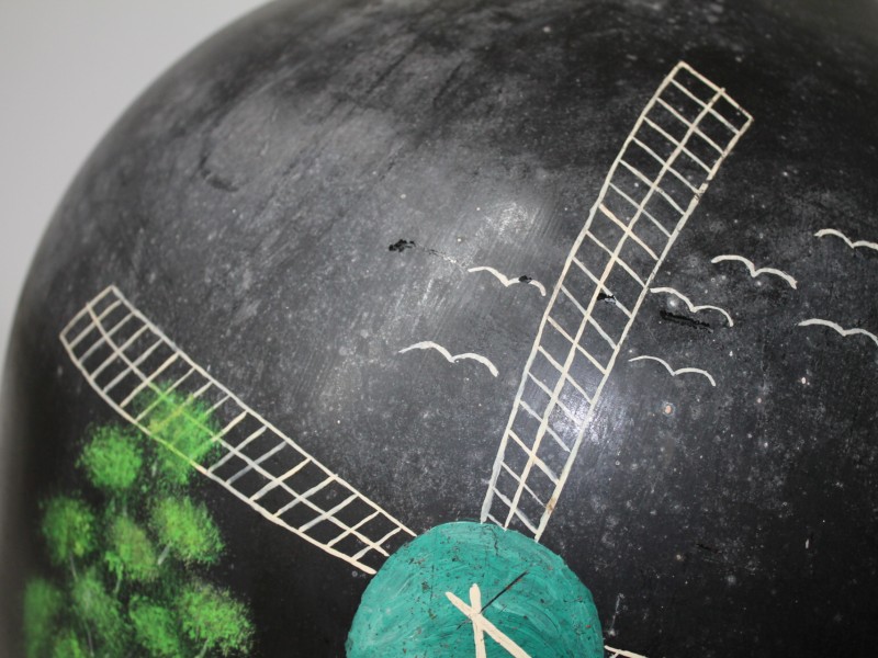 Deze grote Dame-Jeanne is handbeschilderd met een Hollands panorama met onder meer een windmolen, gracht en verschillende boerderijen op een zwarte achtergrond. Een Dame-Jeanne, ook ballonfles of gistfles genoemd, is een grote glazen fles waarin wijn kan gisten onder anaerobe omstandigheden. Deze flessen worden ook gebruikt voor het opslaan en vervoeren van andere vloeistoffen. Deze Dame-Jeanne lijkt een volume van 50 liter te hebben. De fles kon worden afgesloten met een schroefdop maar die ontbreekt. De stijl en het tafereel lijken te wijzen op een leeftijd van ongeveer 60 jaar. Dit soort beschilderde fles wordt soms gebruikt om siertakken in te stekken maar kan ook gewoon als decoratie worden opgesteld.