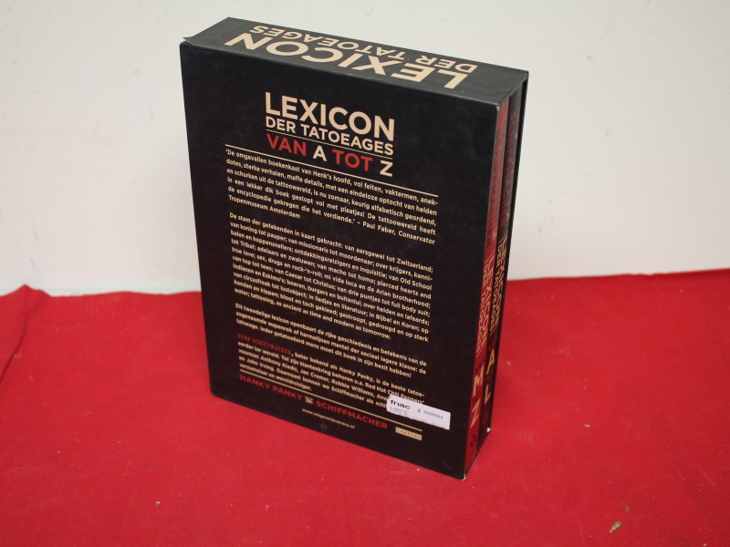 Boeken 'Lexicon der tatoeages (van A tot Z) door Hanky Panky Schiffmacher. Uitgeverij Carrera, 2012. ISBN nr. 9789048813155. 240blz (deel 1), 229blz (deel 2). Softcover.In schuifdoos.