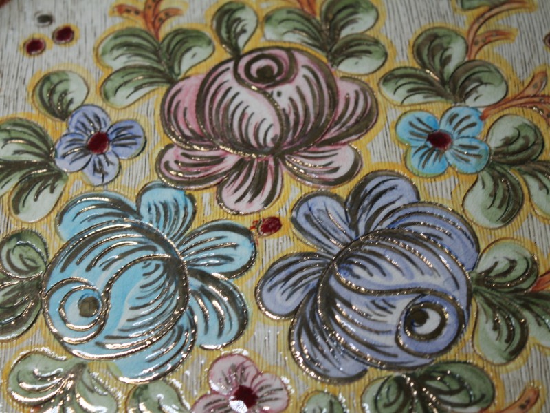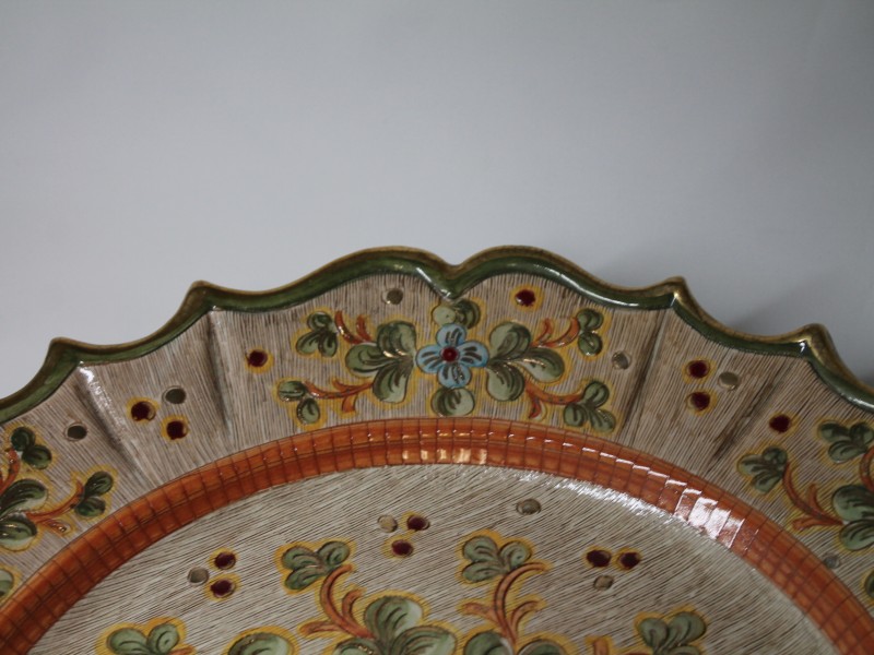 Een handgeschilderd keramisch of aardewerk bord, mogelijk in de stijl van Talavera-keramiek. Het bord heeft een geschulpte rand met goudkleurige accenten. Het is versierd met bloemmotieven in verschillende kleuren, waaronder blauw, roze en geel. Het heeft de mogelijkheid om aan de muur te hangen.