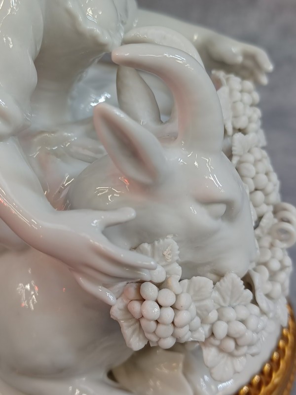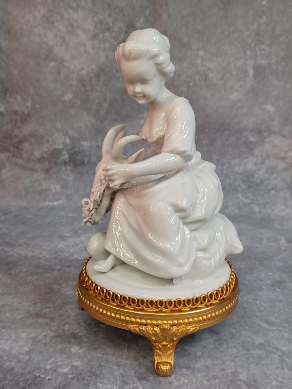 Schitterende wit porseleinen sculptuur. Dit verfijnde beeldje toont een jong meisje in een sierlijke houding, vergezeld door een geit met een druivenkrans. Het geheel staat op een rijk gedecoreerde, goudkleurige metalen voet die de hoogwaardige uitstraling compleet maakt.