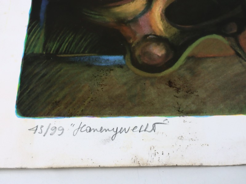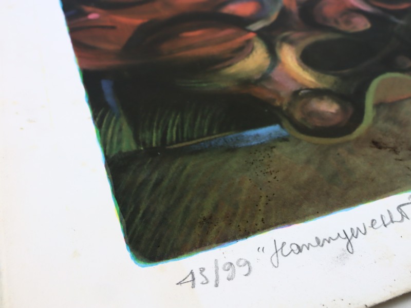 De brede marge rondom de afbeelding biedt ruimte voor presentatie en accentueert de grafische compositie. Onderin is de afdruk handmatig gesigneerd en genummerd, wat de exclusiviteit en waarde van dit werk benadrukt. Dit stuk is uitermate geschikt voor verzamelaars van grafiek, kunstliefhebbers van levendige en expressieve diermotieven, en wie bijzondere fine‑art reproducties waardeert.