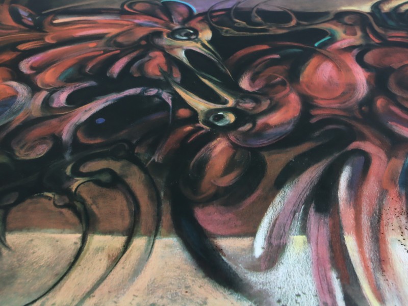 Deze dynamische en bijzondere grafische afdruk in beperkte en gelimiteerde oplage toont een hanengevecht in volle actie, waarbij twee hanen in gespannen, agressieve houding tegenover elkaar staan. De uitgespreide vleugels, krachtige poten en scherp afgetekende klauwen benadrukken de energie en dramatiek van de scène. Door de contrasterende kleuren en de vloeiende beweging van de figuren krijgt het werk een intense visuele impact, waarbij elk detail van het gevecht zorgvuldig is vastgelegd.