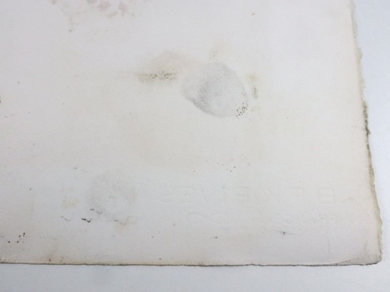 Deze prent had duidelijk last van vochtplekjes onderaan, dit moet gereinigd worden. Er is geen kader. Achterkant stempel gerechtsdeurwaarder. Levering in koker.