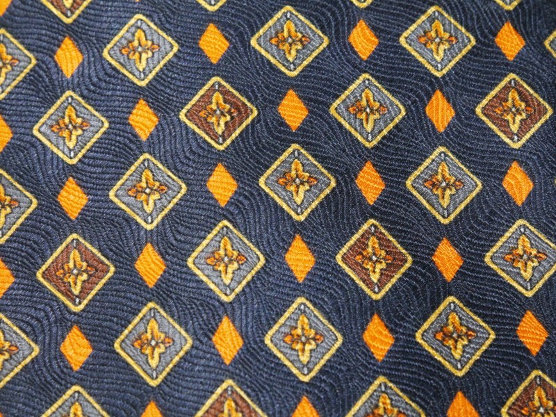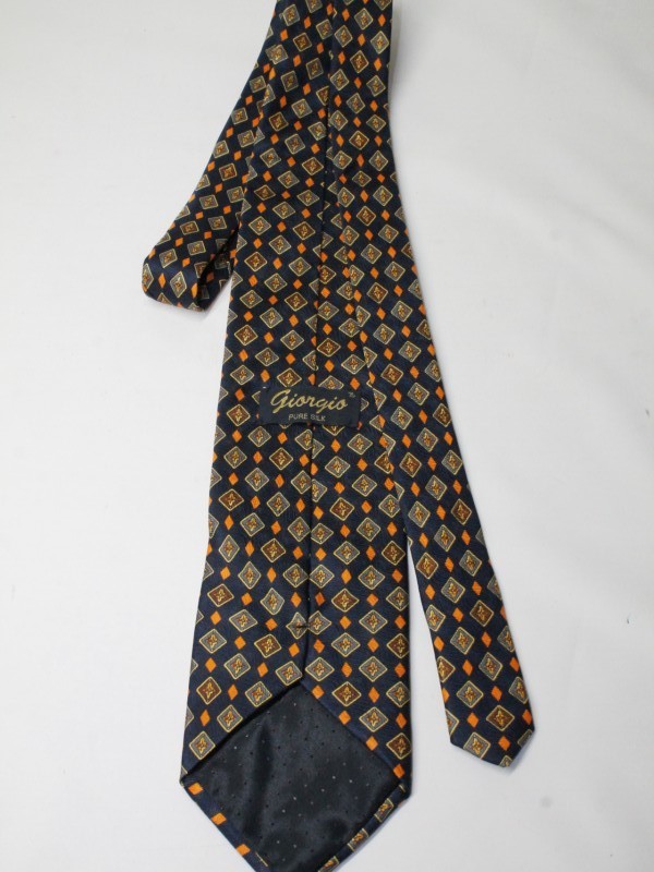 Een vintage stropdas van Giorgio Armani. De stropdas heeft een marineblauwe kleur als basiskleur en is gecombineerd met opvallende vierkante of ruitvormige patronen in oranje. Het geometrische patroon is veelzijdig en kan worden gedragen bij zowel formele gelegenheden als hedendaagse gelegenheden. De blauwe en oranje kleuren zijn complemantaire kleuren, waardoor ze een levendig contrast creeren dat de outfit doet opvallen.