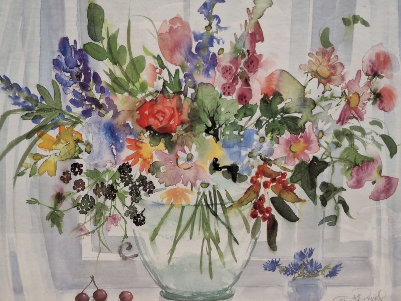 De aquarel Garden Bouquet van Celia Russell toont een levendig en harmonieus bloemstilleven in een glazen vaas. Een weelderig boeket van tuinbloemen — met tinten rood, roze, blauw, geel en fris groen — is los en schilderachtig uitgewerkt. De transparante verflagen en zachte penseelstreken geven het werk een lichte, frisse uitstraling en laten het natuurlijke karakter van aquarel volledig tot zijn recht komen.