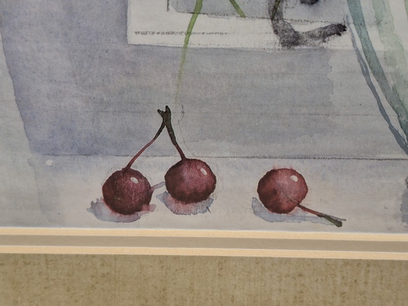 De compositie is uitgebalanceerd en sfeervol, met subtiele details zoals kersen op de voorgrond en een klein vaasje bloemen op de achtergrond. Het werk is gesigneerd en professioneel ingelijst in een klassiek goudkleurig kader met linnen passe-partout. Een warm en tijdloos kunstwerk dat rust en kleur brengt in elk interieur.