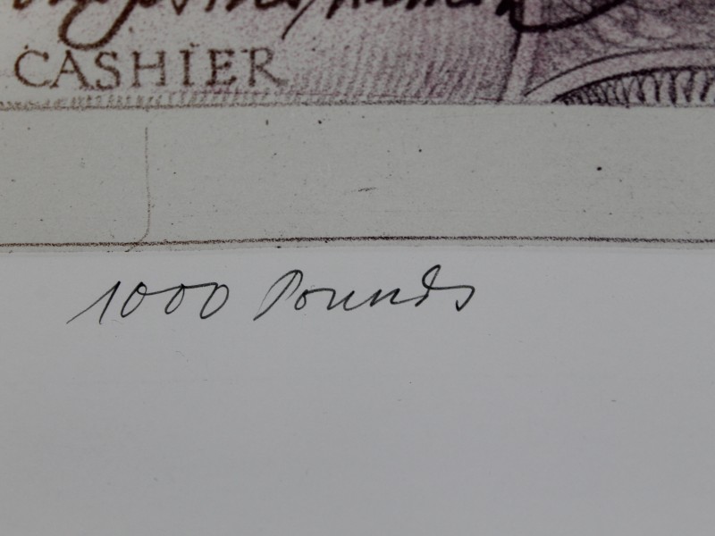Kunstwerk getiteld "Funny Money - 1000 Pounds" van Oldřich Kulhánek.