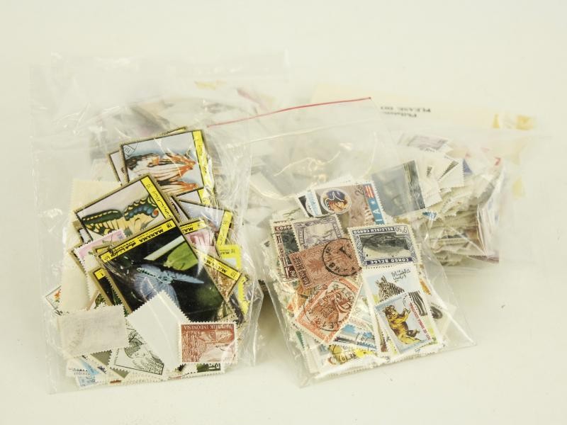 - Plastic zakjes gevuld met postzegels en een stapeltje van losse zegels.