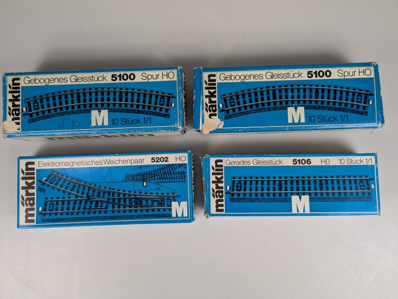 Märklin M-rails, bestaande uit rechte rails, gebogen rails, aansluitrail en een elektromagnetisch wisselpaar