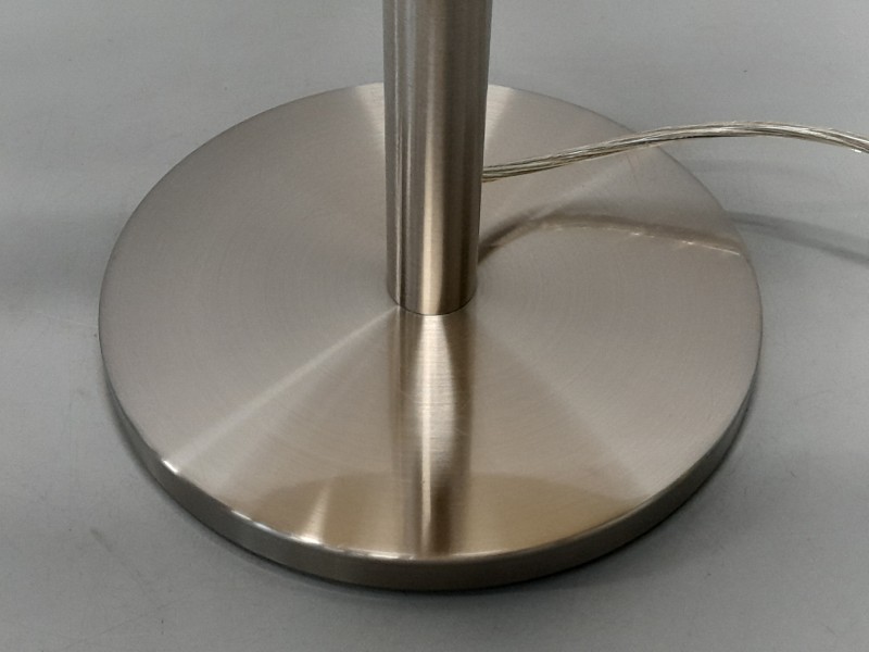- De lamp is uitgevoerd in geborsteld roestvrij staal (RVS), met een stevige ronde voet en een slanke, verticale stengel.