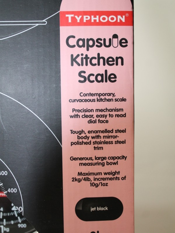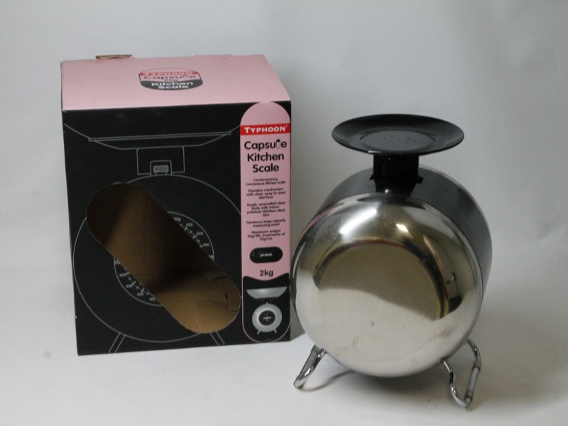 Een zwarte mechanische keukenweegschaal van Typhoon. Het maximumgewicht bedraagt 2 kg. De weegschaal heeft een robuuste, geëmailleerde stalen behuizing met spiegelgepolijste roestvrijstalen afwerking. Kan enkel als een decoratief object gebruikt worden doordat de weegschaal niet meer goed functioneert.
