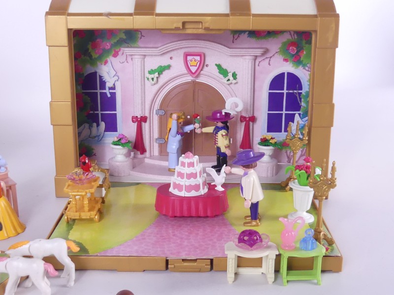 Twee uitklapbare Playmobil koffers in prinsessenthema, uit 2004. Elke koffer opent tot een sprookjesachtig paleisinterieur, compleet met figuren, dieren en tal van accessoires.