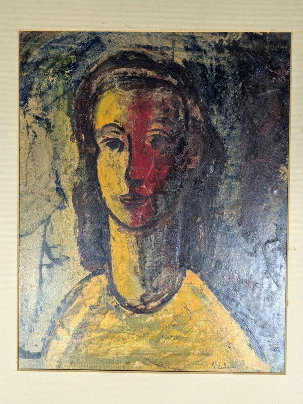 Het werk toont een gestileerd vrouwenportret in krachtige kleuren (geel, rood en donkere tinten).