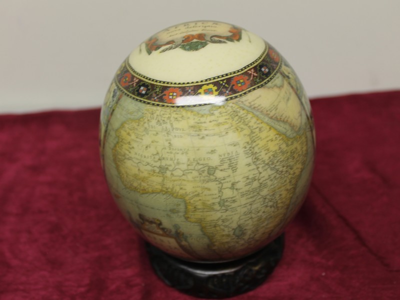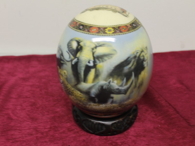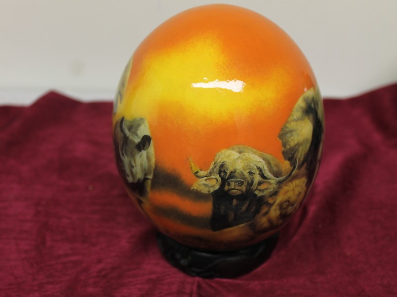 Set van 4 gedecoreerde struisvogeleieren op houten standaards. De eieren hebben verschillende motieven gaande van de 'big five' uit Afrika, tot de landkaart van Afrika. Met drie extra reserve standaards. De eieren zijn ongeveer 15cm hoog en hebben een diameter van ongeveer 12cm.