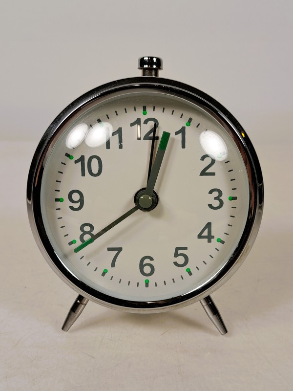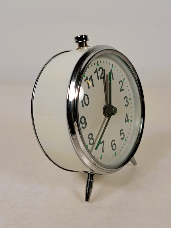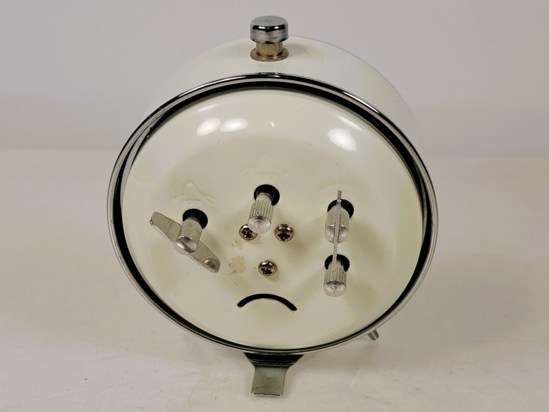 – Een klassieke witte metalen klok met dubbele bel en rode secondewijzer