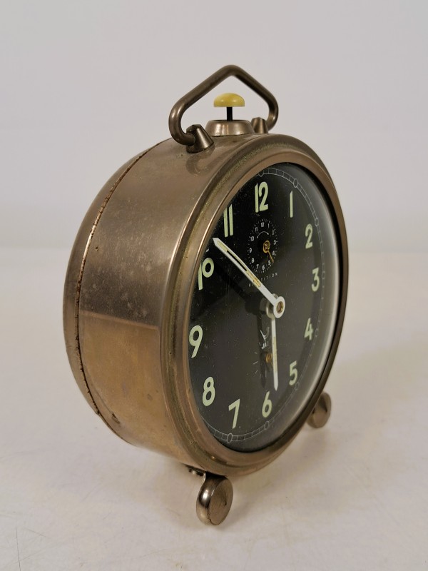 – Een zwarte wekker met messingkleurige behuizing en extra wijzerplaat voor alarmtijd