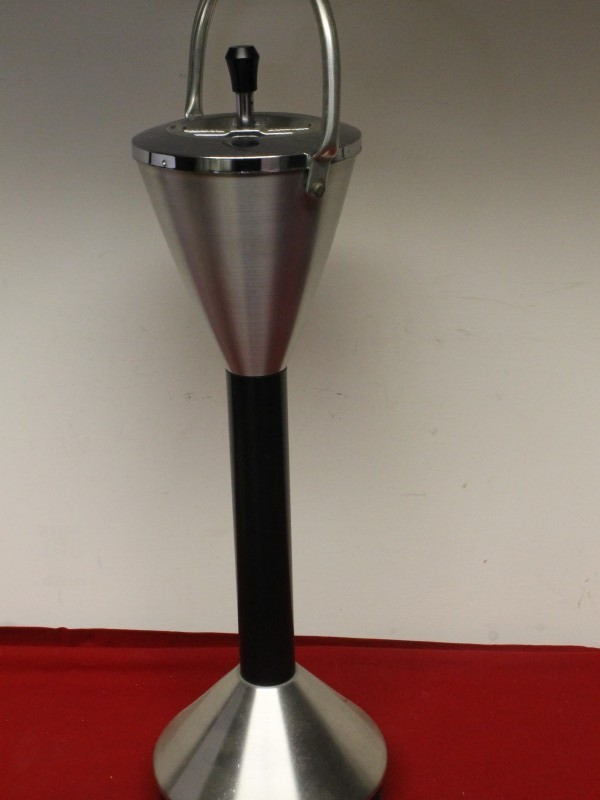 Mooi vormgegeven staande retro asbak die uitgevoerd is verschillende soorten metaal. Het asbakgedeelte is uitgevoerd met een draaischijf. Deze schijf zorgt ervoor dat de assen in de opvangbak eronder geraakt en maakt dat de asbak minder geur verspreidt.