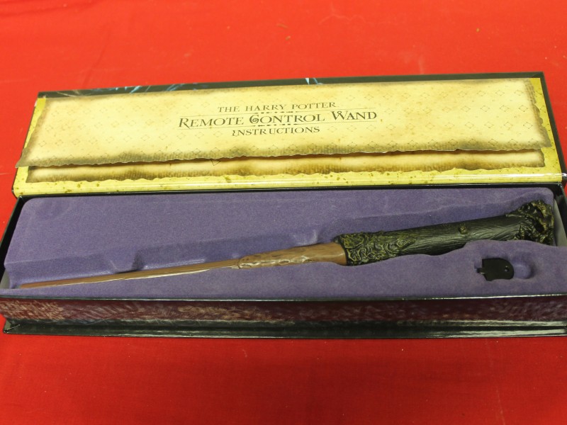 Harry Potter Afstandsbediening Toverstaf, geproduceerd door The Noble Collection. Het is een afstandsbediening in de vorm van een toverstaf die werkt met elk apparaat dat een infrarood (IR) afstandsbediening gebruikt, zoals een tv, dvd-speler of stereo. De toverstaf kan worden geprogrammeerd met maximaal negen gebaren om verschillende functies te bedienen, zoals het volume aanpassen of van zender wisselen. De toverstaf is gemodelleerd naar de rekwisiet uit de Harry Potter-films. Het wordt geleverd in een verzameldoos met geïllustreerde instructies. Exclusief batterijen. Niet getest.