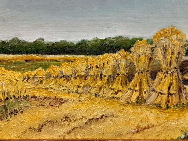 - Beschrijving: Dit prachtige olieverfschilderij van Denise Verbeken toont een idyllisch landschap met een rustieke oogsttafereel. In het midden van het schilderij zie je een pad dat zich door gouden graanvelden slingert, omzoomd door bundels graan die klaarstaan om geoogst te worden. De lucht is weids en licht, met zachte wolken die een vredige sfeer creëren.