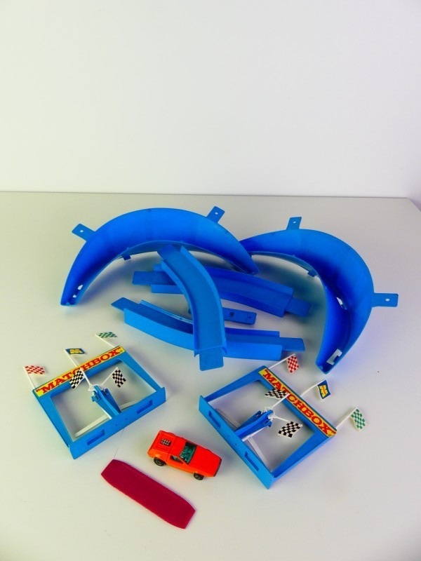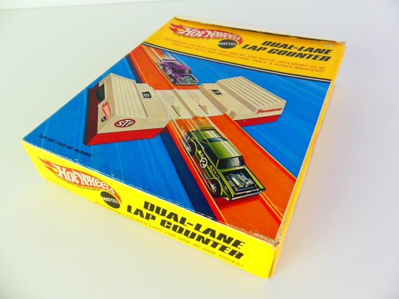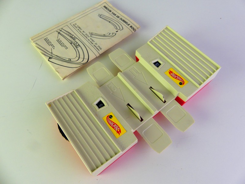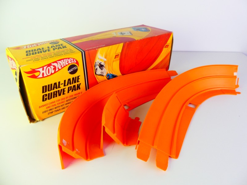 Zeldzame Hot Wheels Dual-Lane Curve Pak inclusief de karakteristieke oranje bochten en blauwe finishpoortjes (Matchbox). Deze set bevat ook de originele Dual-Lane Lap Counter én een autootje.