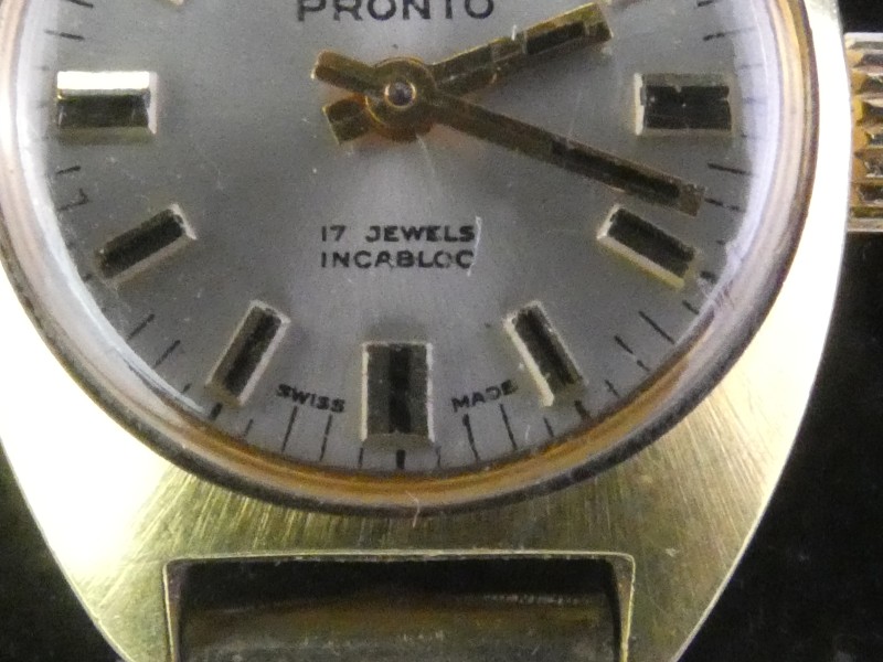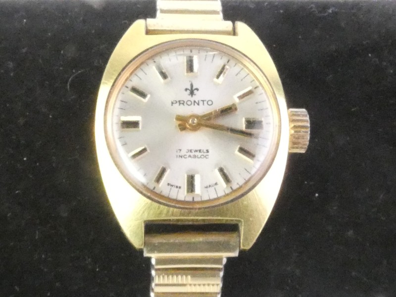 Elegant vintage dameshorloge van het Zwitserse merk Pronto, vermoedelijk daterend uit de jaren ’70. Pronto is een historisch Zwitsers horlogemerk, opgericht rond 1890, en stond bekend om zijn degelijke mechanische uurwerken met betrouwbare Zwitserse gangwerken.