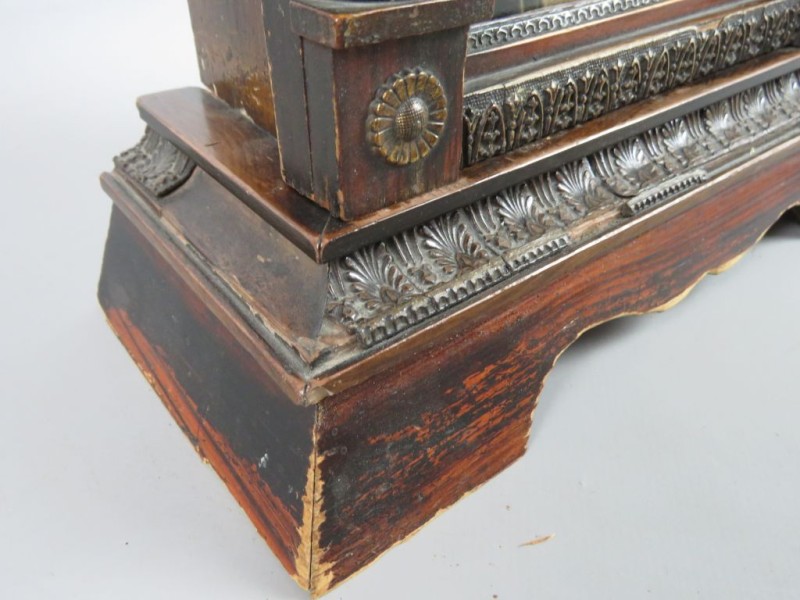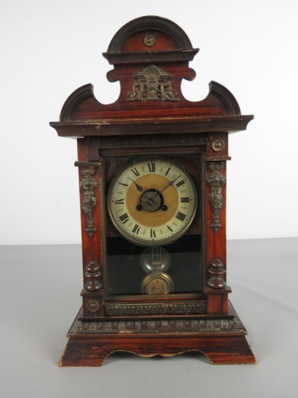 Dit is een antieke houten tafelklok (pendule), waarschijnlijk van Duitse of Centraal-Europese makelij uit het einde van de 19e of het begin van de 20e eeuw.