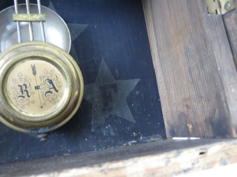 Uurwerk: Een mechanisch uurwerk met een slinger. Op de slinger staan de letters "R - A" (Retard / Avance), wat dient voor de snelheidsregeling. Op de achtergrond is een ster met de letter "F" zichtbaar, wat waarschijnlijk het merkteken van de fabrikant is (mogelijk Friedrich Mauthe of een vergelijkbare Duitse maker).