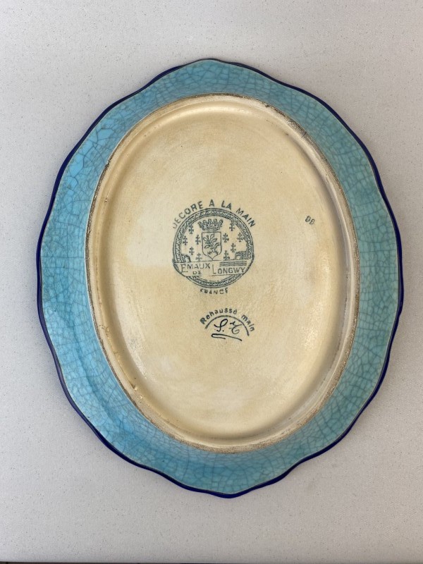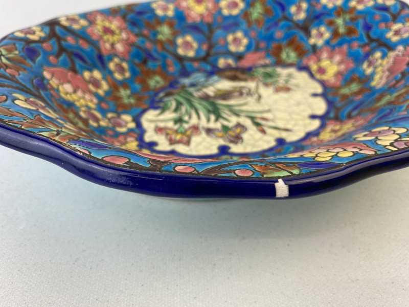 Dit is een uitzonderlijk en zeldzaam Art Deco pronkstuk: een diep bord of centre de table uit de beroemde ateliers van Longwy. Het rijke floraal decor en de elegante voorstelling van de kraanvogel maken het tot een object dat zowel artistiek als decoratief hoge waarde heeft.