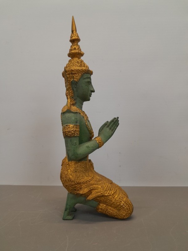 - Vorm en ontwerp: Dit beeldje toont een Thepanom, een vrouwelijke tempelwachter uit de Thais-Boeddhistische traditie. Ze staat in een knielede, beschermende houding, met een lange, gedetailleerde hoofdtooi en een rijkelijk versierd kostuum. Haar handen zijn gevouwen in een gebaar van eerbied of bescherming.