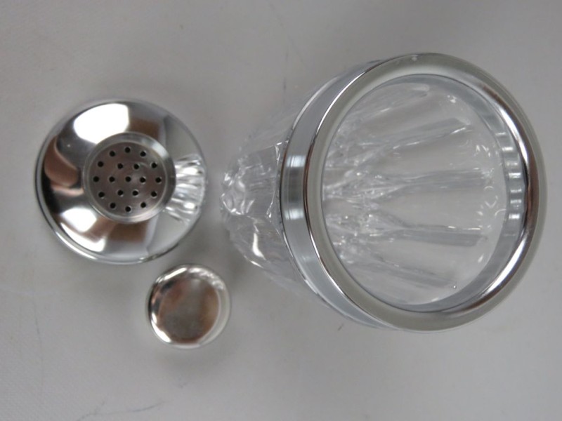 Het is een drieledige cocktailshaker, ook wel een 'Cobbler' shaker genoemd, bestaande uit de beker, een geïntegreerd zeefdeksel en een kleine dop. De beker is gemaakt van helder, geslepen glas, wat het een luxe uitstraling geeft. De rest van de onderdelen zijn van glanzend, verchroomd of roestvrij staal.
