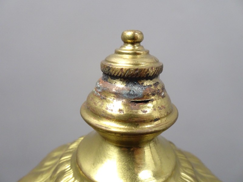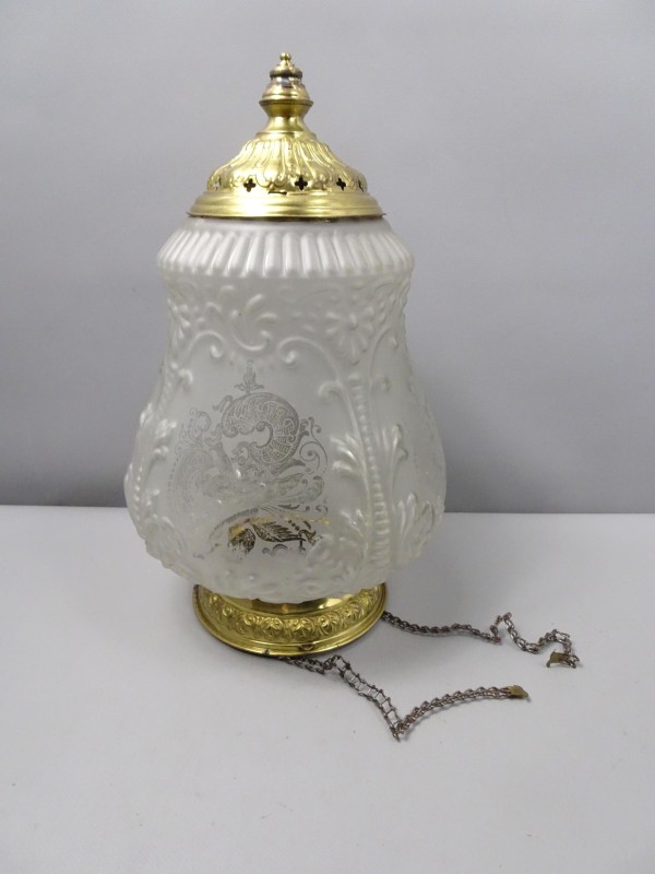 Het ontbreekt 1 ketting aan de ophangbeugel, de montageplaat ontbreekt. Roest aan de punt van de lampenkap, zichtbare gebruikskrassen. Zichtbare barst aan de lampenkap.