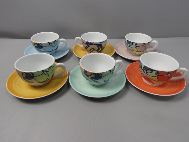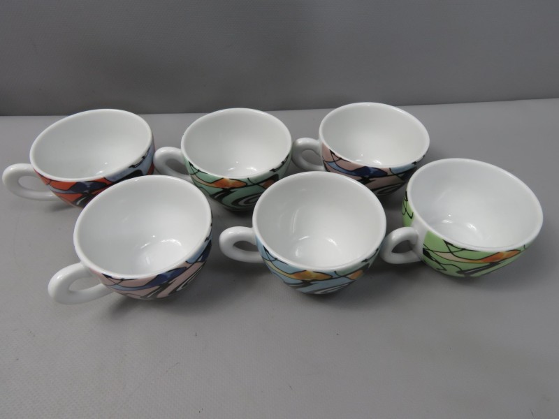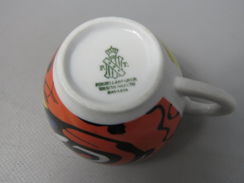 Prachtige koffie/theeservies van verzamelkopjes en schotels in verschillende kleuren van de porseleinfabriek Tirschenreuth Bavaria, met origineel stempel, met nummers 128 en 47. Elk kopje heeft kleurrijke, abstracte afbeeldingen in verschillende varianten.