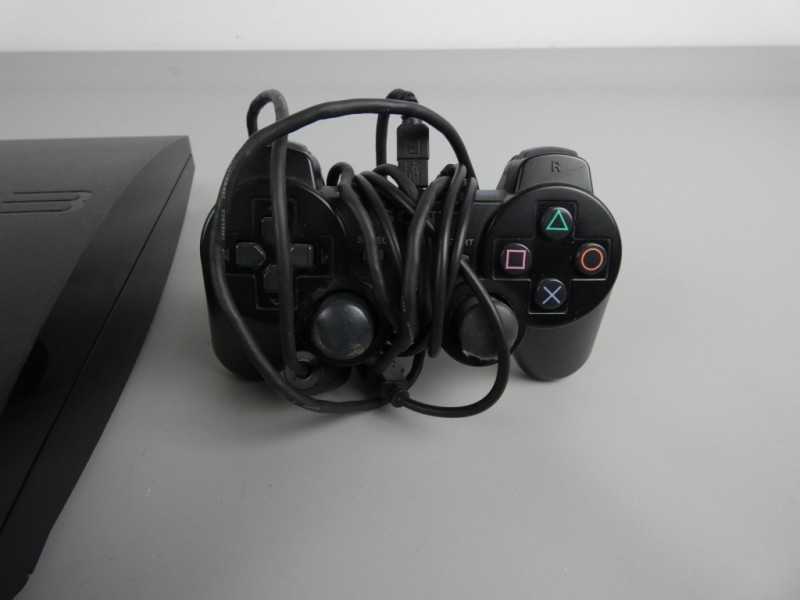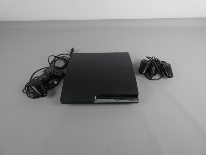 Het is een complete set van een PlayStation 3 Slim console met twee controllers en bijbehorende voedingskabel.
