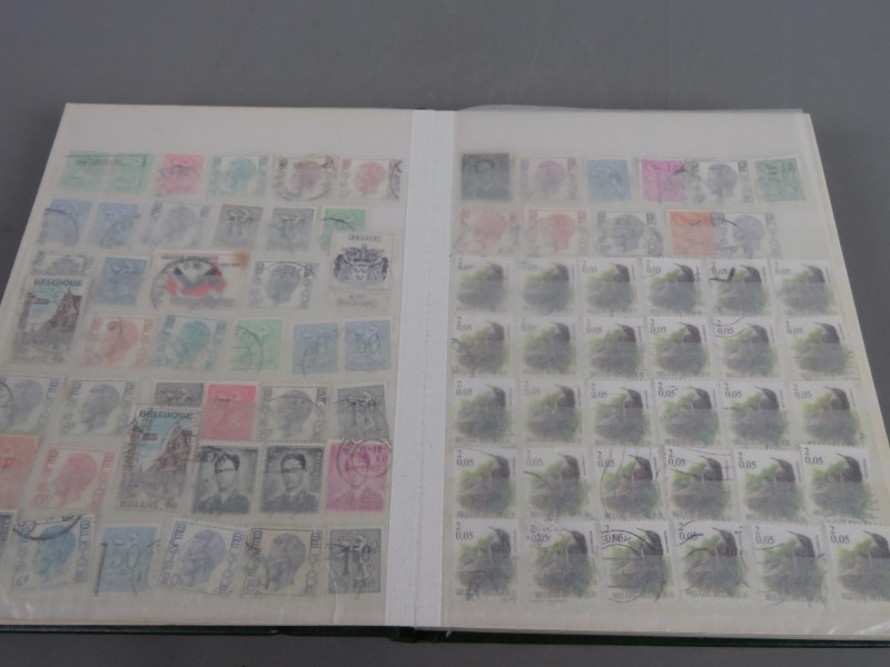Groene postzegel boek met een verzameling van Belgische postzegels. Dubbele exemplaren.