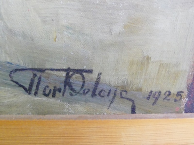 Olieverfschilderij op doek, voorstellend een oudere vrouw zittend in een eenvoudig interieur. Warme aardetinten, expressieve penseelstreken en een rustieke, landelijke sfeer. Gesigneerd en gedateerd 1925 (rechtsonder). In houten lijst.