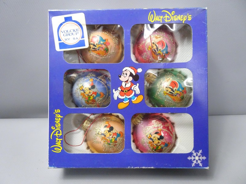 Dit zijn vintage Walt Disney kerstballen van de Volcke Group NV SA, waarschijnlijk daterend uit de jaren 80. De set bestaat uit zes glazen, glinsterende ornamenten met afbeeldingen van verschillende Disney-personages, waaronder Mickey Mouse en Goofey, in een blauwe presentatiedoos.
