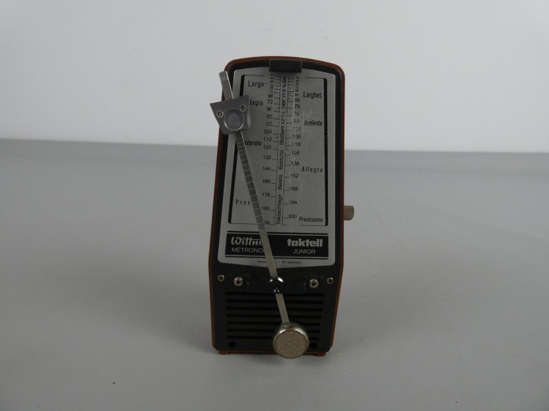 Een klassieke Wittner Taktell Junior metronoom in een stijlvolle bruine uitvoering. Dit iconische instrument van Duitse kwaliteit (Made in W.-Germany) is een onmisbaar hulpmiddel voor iedere muzikant.