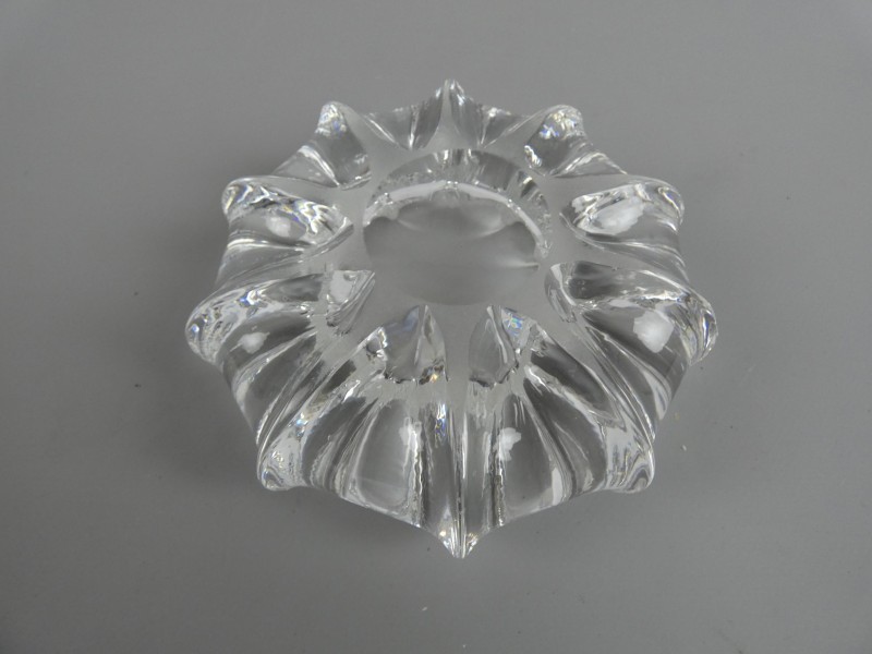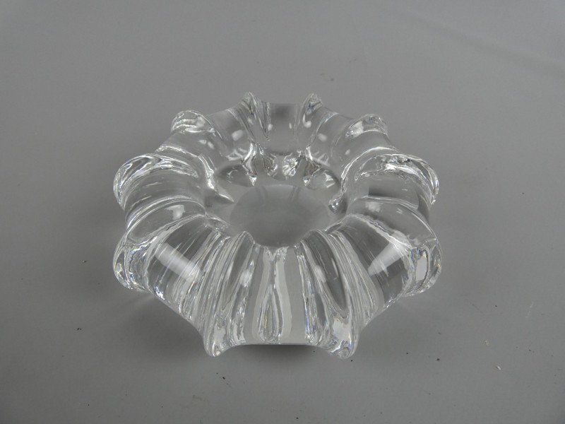 Deze asbak is niet alleen een praktisch gebruiksvoorwerp, maar een echt decoratief statement op tafel. Door het aanzienlijke gewicht staat de asbak zeer stabiel. Het glas is volledig helder en verkeert in uitstekende staat. Het tijdloze ontwerp doet denken aan de bekende Mid-Century Modern stijl van bekende glasstudio's.