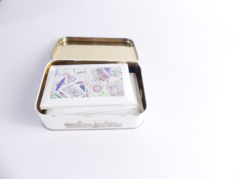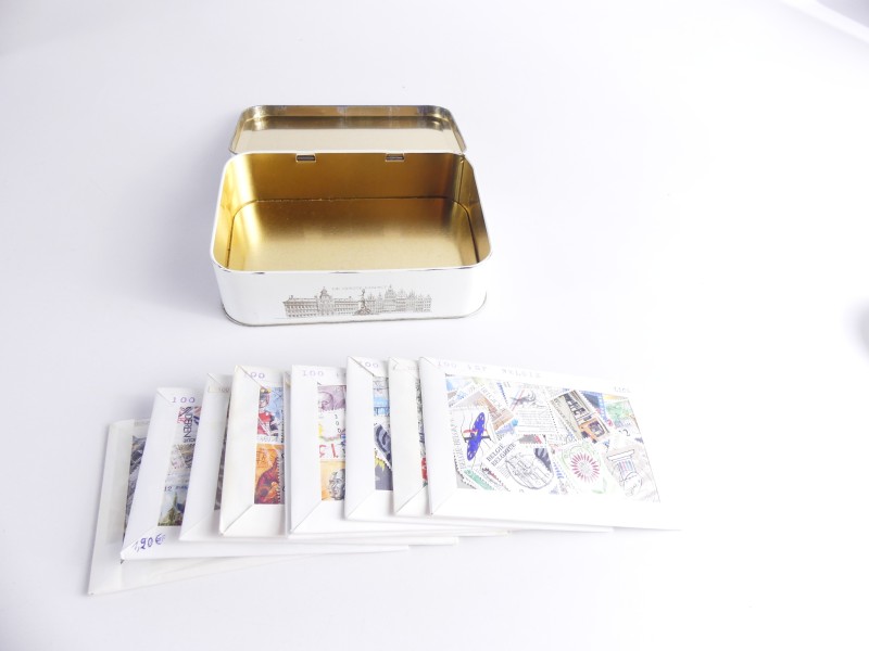 - blikken doos met 9 pakjes bestempelde postzegels uit Blegie