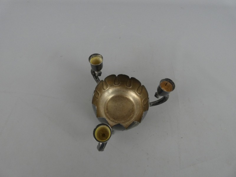 De kandelaar lijkt gemaakt van metaal (mogelijk verzilverd koper of messing) met een aanzienlijk patina of aanslag, wat het een antieke uitstraling geeft. De binnenkant van de schaal en de houders tonen nog een lichtere, goudachtige metaalkleur.