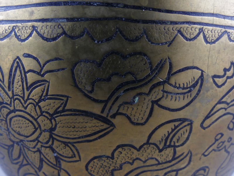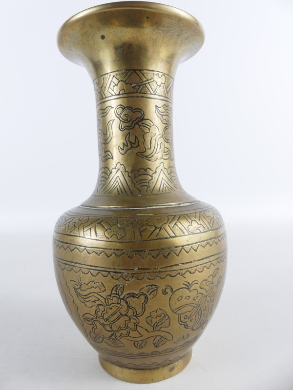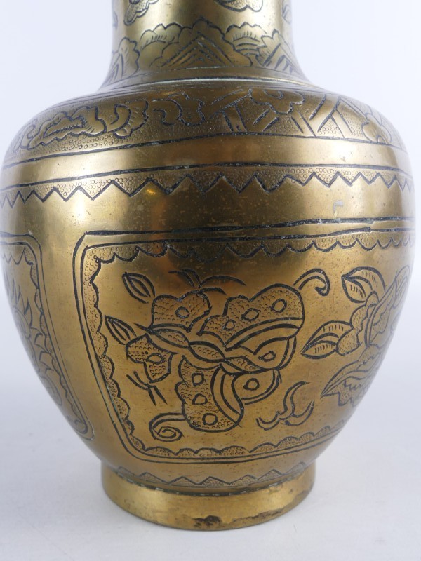 Prachtig paar messing vazen met gegraveerde bloem- en geometrische motieven. Beide vazen hebben een bolvormig lichaam, een slanke hals en een wijde, licht uitlopende rand.