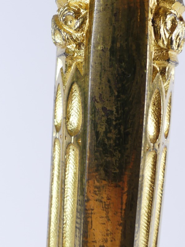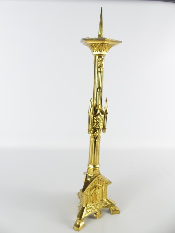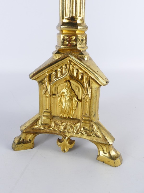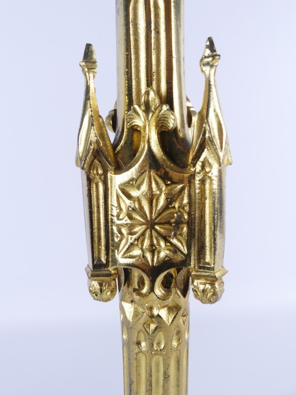 Een paar vintage kandelaars in een neogotische stijl, vervaardigd uit verguld messing.