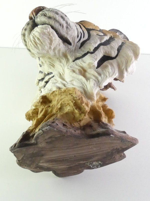Decoratief tijgerbuste - een realistische interieursculptuur gemaakt van polyresin (hars met vulmiddel). De gedetailleerde handbeschildering benadrukt de structuur van de vacht en de kenmerkende tijgerstrepen. De binnenzijde is hol, wat typisch is voor moderne decoratieve beeldwerken.