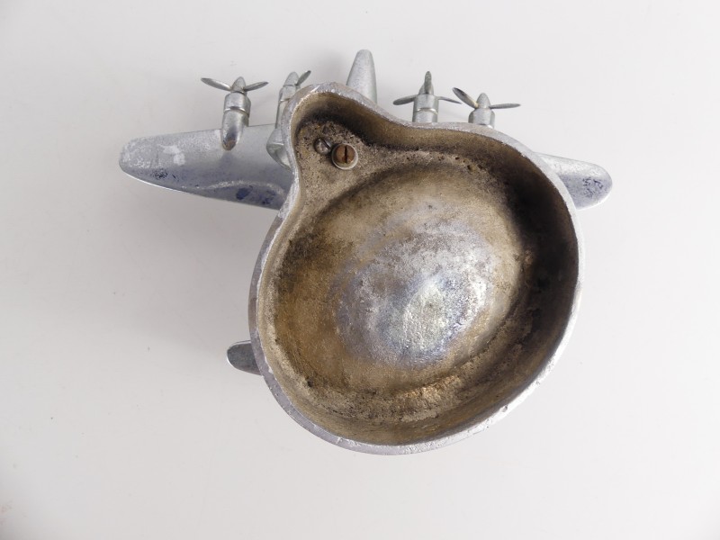 Vintage metalen asbak met een vliegtuig beeldje bovenop.